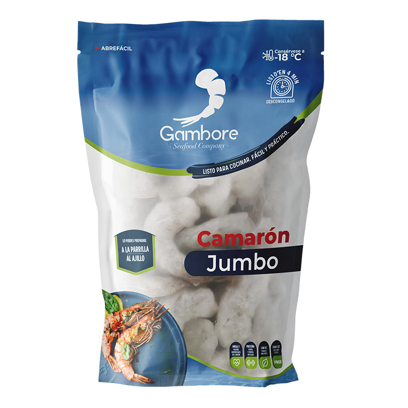 • 454 gramos de camarón jumbo GAMBORE pelado y devenado con cola